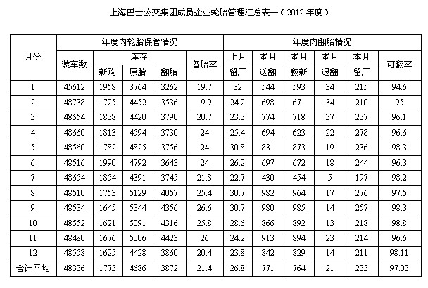 按照2012年新胎購(gòu)置成本,40.2萬(wàn)元可購(gòu)243條輪胎。報(bào)表以充分說(shuō)明上海公交對(duì)節(jié)約輪胎資源,所采取的措施、方法是相當(dāng)有成效的,有效履行企業(yè)對(duì)節(jié)約資源、_創(chuàng)建低碳社會(huì)的責(zé)任。