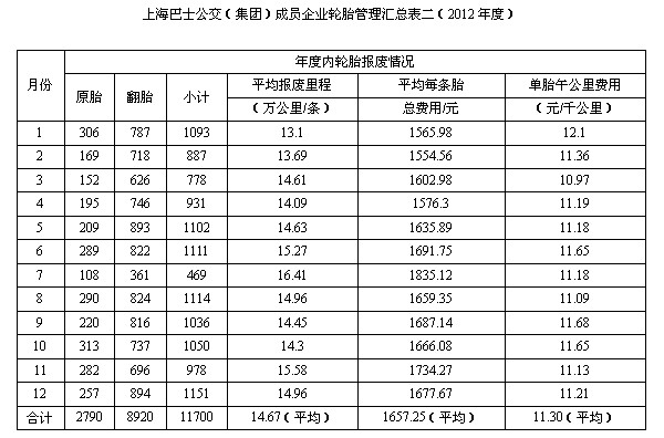 2、盡管2012年裝車(chē)總數(shù)比2011年減少3%,但是輪胎報(bào)廢數(shù)減少7%(其中原胎報(bào)廢數(shù)減少11%,翻新胎減少5%)。這是在單胎總費(fèi)用上升141.71元,也即上升幅度9%的情況下取得的,說(shuō)明上海公交對(duì)節(jié)約輪胎資源的意識(shí)是比較有前瞻性的。